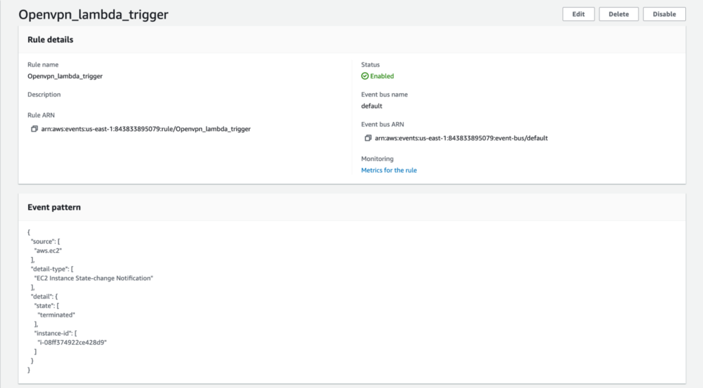 Once the Snapshot policy is up, all that is left is to set up monitoring on the target instance for any service downgrade. We accomplished that with an Event Rule that looked for state changes on the instance, which triggered an AWS Lambda instance in case it went down.